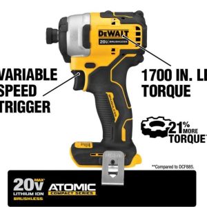 Includes (1) DEWALT DCD708B ATOMIC 20-Volt MAX compact 1/2 in. cordless drill/driver, (1)DEWALT DCF809B ATOMIC 20-Volt MAX compact 1/4 in. cordless impact driver, (2) 20-Volt MAX lithium-ion 1.3 Ah battery packs, 20-Volt MAX charger and contractor bag
