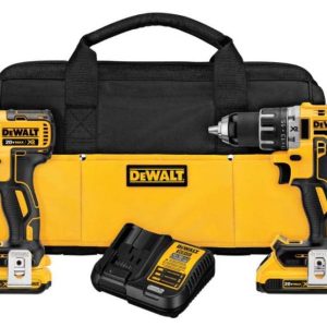 This 20-Volt MAX Brushless Compact 2-Tool Combo Kit includes 1 cordless Drill/Driver, 1 cordless Impact Driver, two 20-Volt MAX Lithium Ion Batteries, 1 charger, and a carrying bag. At only 5.1 in. front to back, the cordless Impact Driver features a high performance brushless motor that delivers 1700 in./lbs. of torque and 3 LED lights to provide optimum illumination in dark spaces as you work. The cordless Drill/Driver features a high performance brushless motor that delivers 340 unit watts outs (UWO) and LED foot light to provide optimum illumination in dark spaces as you work. Both tools feature an ergonomic design for balance and easier tool control along with removable belt hooks