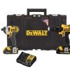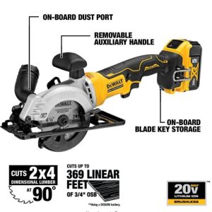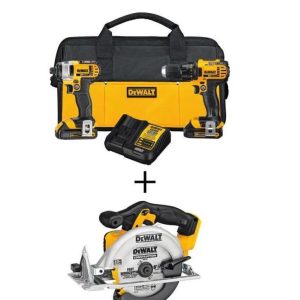 This 20V MAX* brushless cordless 4-tool combo kit includes one 1/2 in. drill/driver, 1/4 in. impact driver, 4-1/2 in. circular saw, LED work light, charger, two lithium ion 2.0Ah batteries, and tool bag. The DCD708 drill/driver is only 6.3 in. front to back, and its high-performance brushless motor delivers up to 340 unit watts out (UWO). The DCD809 is only 5.1 in. front to back with a brushless motor that delivers 1700 in-lbs. of torque. The DCL040 is equipped with integral hook for hands-free use in multiple placements and provides up to 110 lumens for superior visability. The DCS571 circular saw features a bevel gear design allowing users to cut 2x material at 90 degrees and 1x material at 45 degrees.