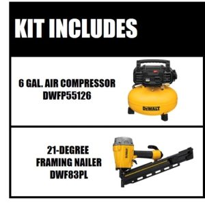 Product OverviewThe DEWALT DWFP55126 6 Gal. Air Compressor is designed with a high efficiency motor for easy start up in cold weather or extension cord applications. This compressor has 2 universal couplers to easily support 2 users. The DWFP55126 features a long life oil-free pump for maintenance-free operation. For a limited time get a bonus with purchase.165 max PSI 6 Gal. tank (22.7 L) and 2.6 SCFM delivered and 90 PSI pump; enable long tool run time with quick recovery75 dBA noise level for a quiet work settingHigh flow regulator and couplers to maximize air tool performanceConsole cover protects controls and is removable to allow easy repairOutlet tube rerouted to avoid being catch pointProtective rubber leg covers to prevent marringBall drain valve for quick and thorough tank drainingConvenient cord wrap for easy storageHigh-flow regulator for increased performanceDWF83PL moving cylinder engine designed to reduce recoilDWF83PL extruded aluminum magazine for extreme durabilityDWF83PL lightweight at only 8 lbs.DWF83PL compact size is only 12.5 in. tallDWF83PL tool-free depth of drive adjustment, selectable trigger and adjustable rafter hookDWF83PL drives 21 plastic collated framing nails from 2 in. to 3 1/4 in. in L and 0.113 in. to 0.148 in. DiaClick here for more information on Electronic Recycling ProgramsInfo & GuidesReplacement Part ListWarrantyUse and Care ManualYou will need Adobe Acrobat Reader to view PDF documents.Download a free copy from the Adobe Web site.Product OverviewCompressor Made in the USA with Global MaterialsTool is lightweight and portable at just 30 lbs.Nailer ideal for high speed and volume framing applicationsInternet #303167402Model #DWFP55126F83PLInfo & Guides